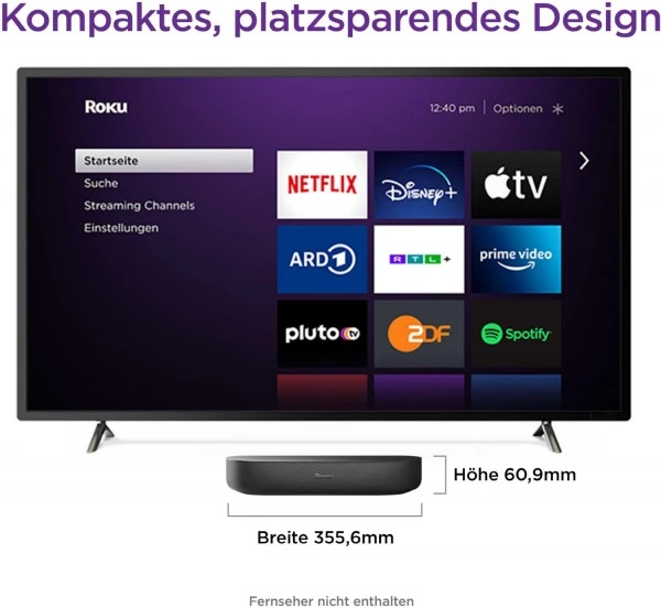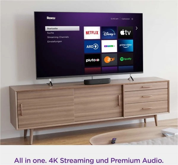 Die Roku Streambar fügt jedem Fernseher reibungsloses Streaming und kinoreifen Sound hinzu. Höre jedes Detail, während du die neuesten TV-Sendungen und Filme in lebendiger 4K HDR-Bildqualität streamst. Klares, sauberes Audio erleichtert das Hören von Dialogen und du kannst sogar laute Werbung automatisch leise stellen. Du wird erstaunt sein, wie etwas so Kleines deinen Raum mit Klang erfüllen kann. Mit Bluetooth und Spotify Connect kannst du deine Lieblingsmusik und mehr streamen. Das Setup ist einfach mit allem, was du benötigst, in der Verpackung, einschließlich einer Sprachfernbedienung, die deinen Fernseher, Sound und Streaming steuert.